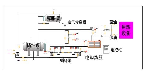 ——右圖是關于電加熱導熱油鍋爐的工藝流程圖,熱量由浸入導熱油的電加熱元件產生的,以導熱油為介質,使用循環(huán)泵,強行導熱油進行液相循環(huán),將熱量傳遞給用一個或多種用熱設備,經用熱設備卸載后,從頭經過循環(huán)泵,回到加熱器,再吸收熱量,傳遞給用熱設備 ,如此周而復始,完成熱量的接連傳遞,使被加熱物體溫度升高,到達加熱的技術要求.