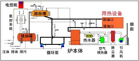 3、導熱油出口溫度顯示:可現場顯示并遠傳至控制柜經儀表顯示,用戶可設定此溫度數值,并可與引風機聯鎖,實現自動調整運行,并高溫報警。